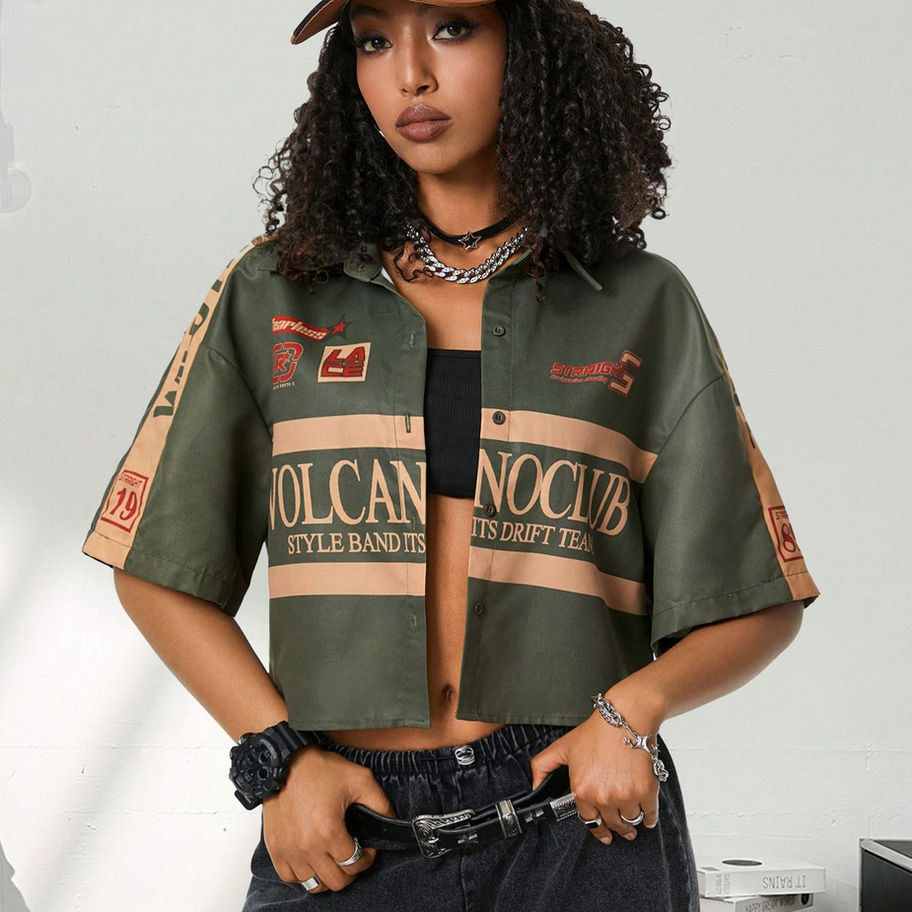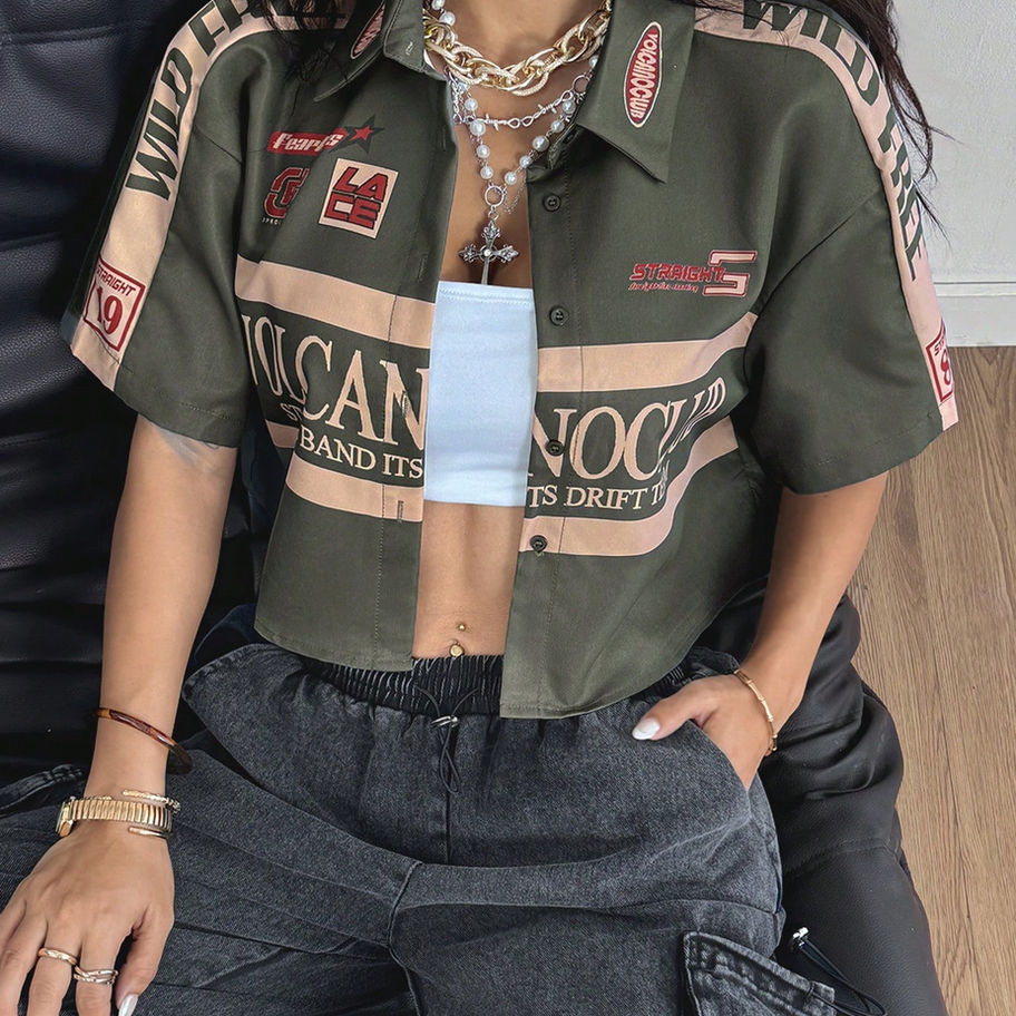 This casual, unlined shirt features a standout colorblock, geometric, and letter pattern, offering an edgy, modern vibe. With its button-front details, collar neckline, and drop shoulder short sleeves, it ensures a loose and comfortable fit that’s perfect for any casual outing. Made from a stretchy fabric, this crop top brings both style and ease, embodying Urban Runway's commitment to merging timeless sophistication with current trends.