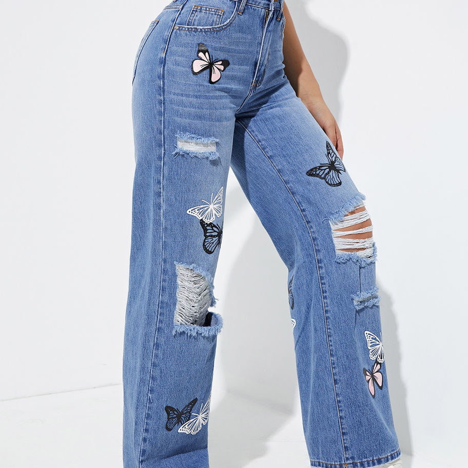 Butterfly Print Ripped Straight Leg Jeans