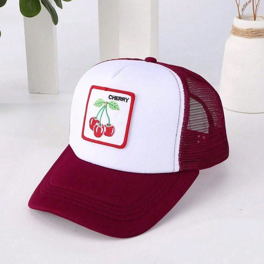 A casual baseball mesh cap featuring contrast mesh panels, embroidered animal, letter, and fruit & vegetable prints, designed with a breathable fit and a ponytail-friendly opening for added convenience.
