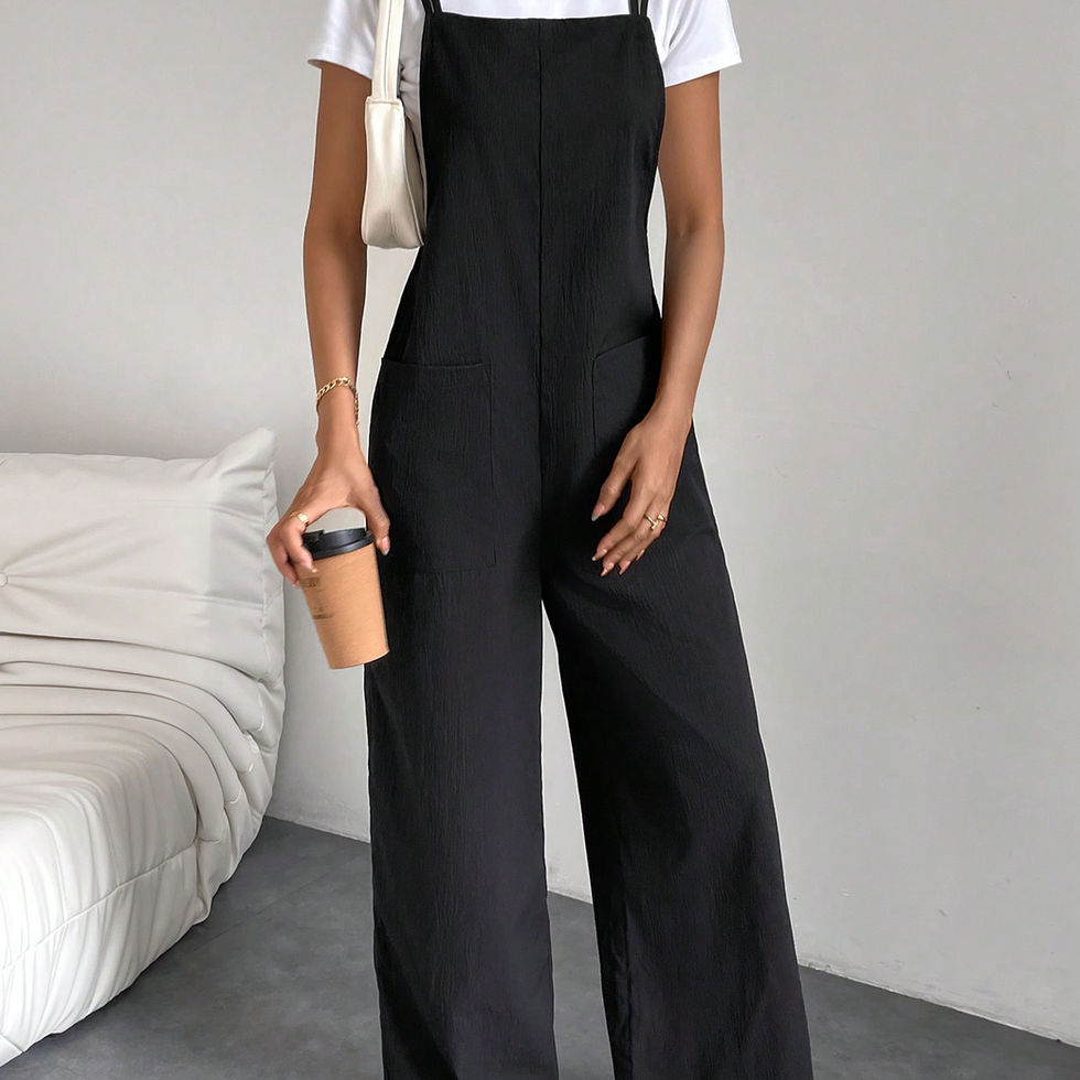 Casual cropped overalls featuring a natural waistline, spaghetti straps, and pocket details, crafted from non-stretch 100% polyester for a relaxed yet structured fit; machine wash or dry clean.