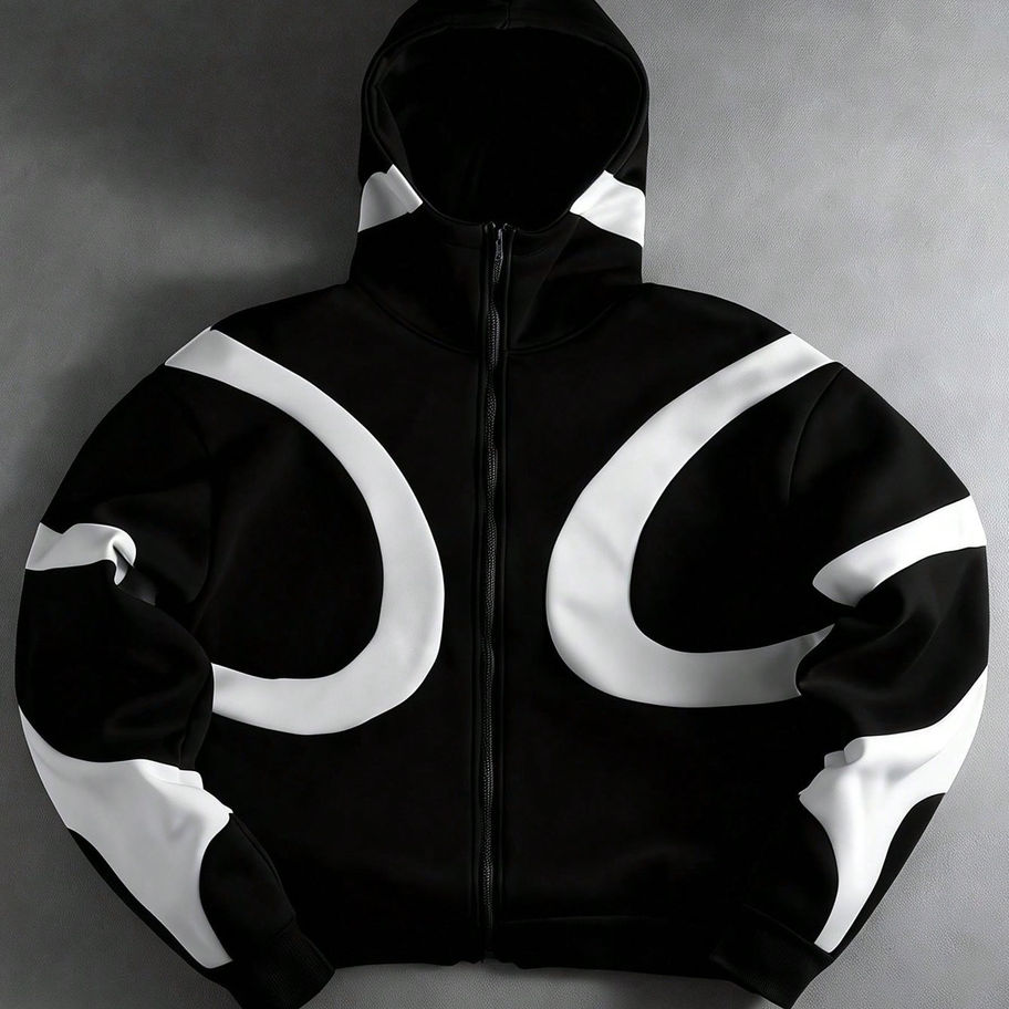 Experience the perfect blend of style and comfort with the Curved Line Zip-Up Hoodie from Urban Runway. Crafted from 100% polyester knitted fabric, this black hoodie features a loose fit and regular length for easy layering, while the drop shoulder and three-quarter length sleeves enhance its relaxed, modern silhouette.