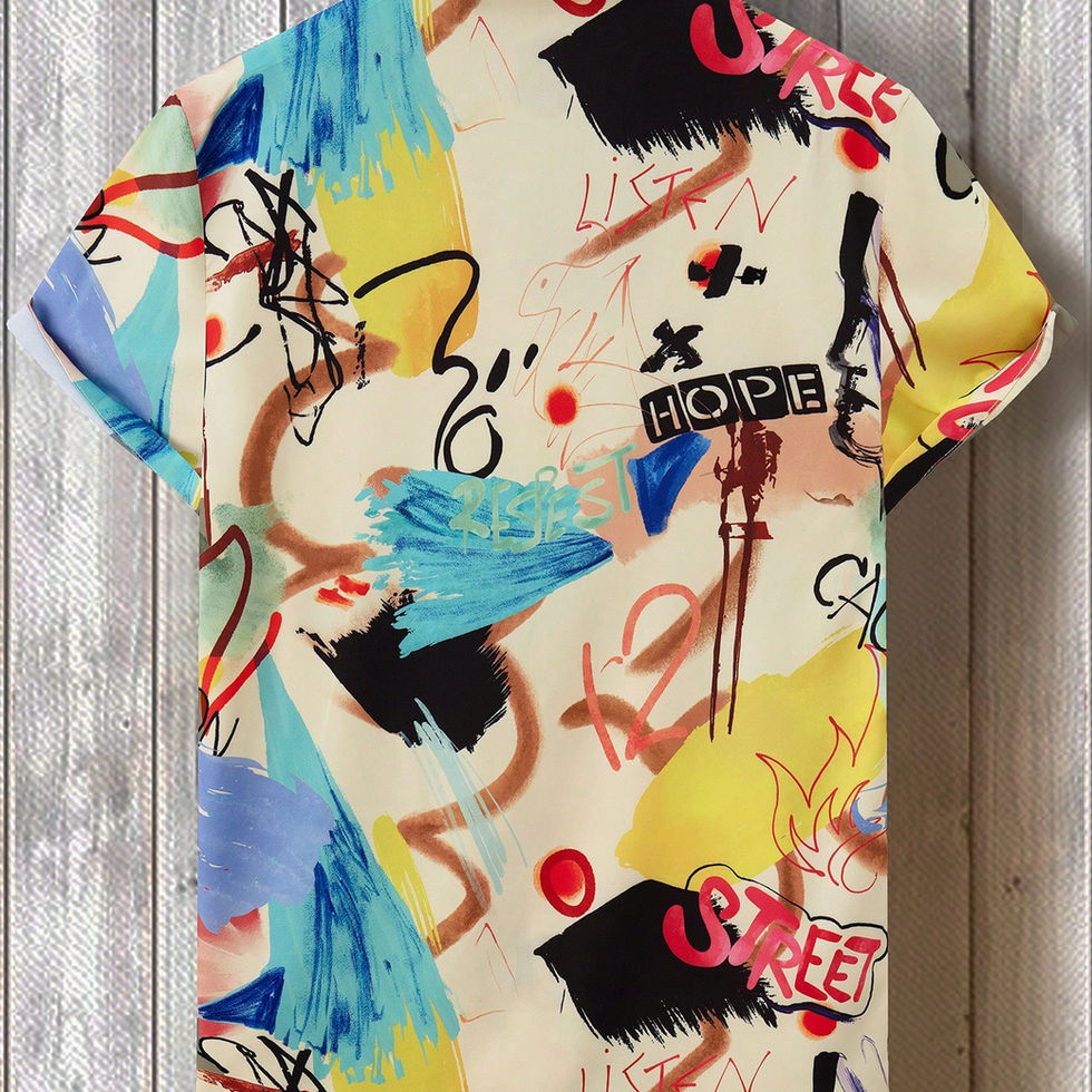 Discover the perfect blend of style and sophistication with Urban Runway's Graphic Print Shirt. This multicolor street-style shirt features a striking graphic pattern, lapel neckline, and convenient button front. Designed for a slim fit and crafted from non-stretch 100% polyester fabric, it offers a comfortable regular length with short, regular sleeves. Ideal for making a bold statement, this shirt combines modern trends with timeless elegance. Easy to care for, simply machine wash or opt for a professional dry clean to maintain its vibrant look.