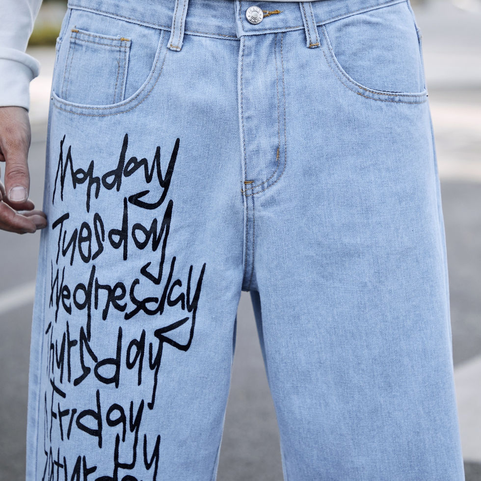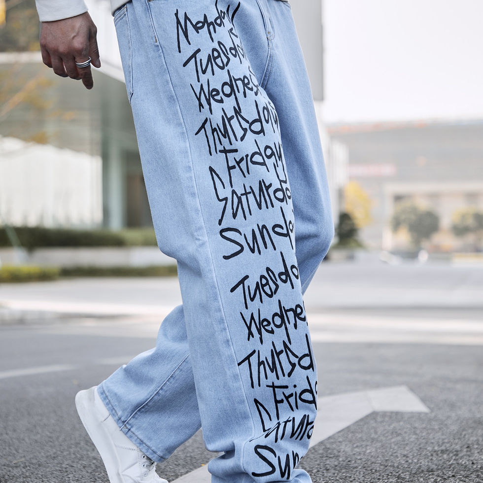 These light wash denim pants feature a “Days of the Week” pattern and are designed with a straight-leg cut. With a zipper fly closure and a natural waistline, these pants provide a loose fit and non-stretch fabric for a comfortable, relaxed look. The material consists of 73% cotton, 18% polyester, and 9% viscose. They come with pockets and are unlined for added breathability.