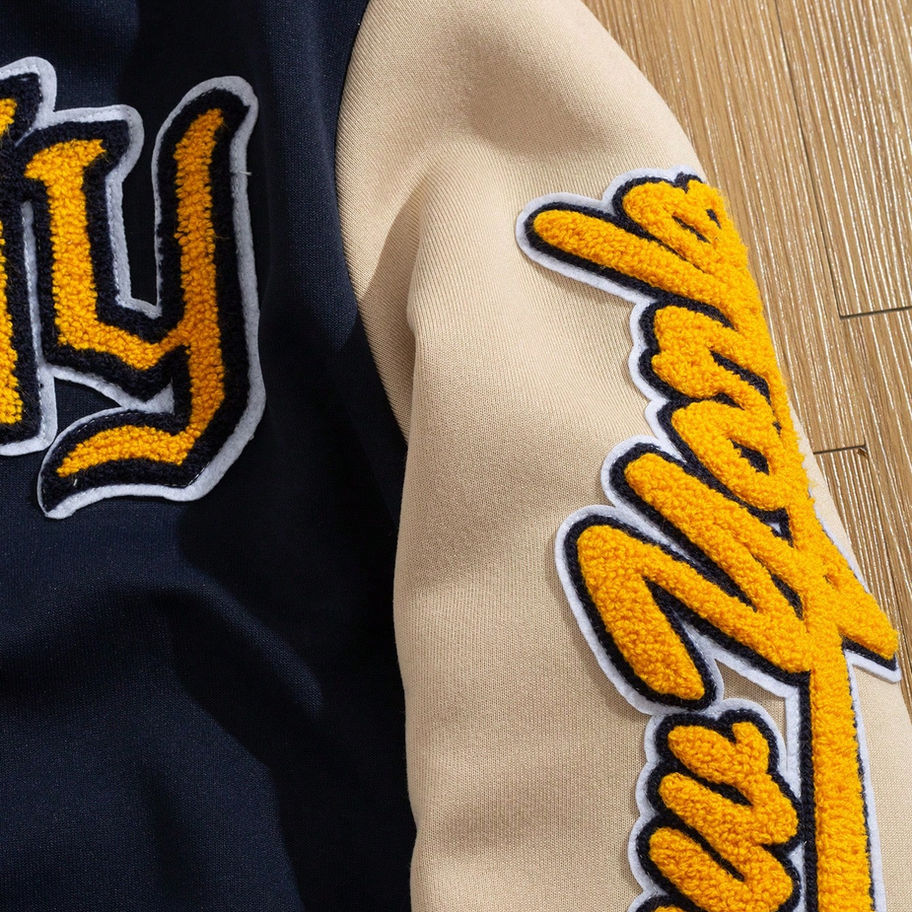 This varsity jacket features a unique coluorblock, letter, and striped pattern, complemented by intricately patched details and a button front closure. Designed for a regular fit, it boasts a baseball collar, single-breasted placket, and regular sleeves, making it a versatile addition to your ensemble. The tight hem and slight stretch of the 100% knitted fabric ensure both comfort and style, perfect for any urban adventure. Embrace a look that stands out yet remains effortlessly chic with this must-have jacket.