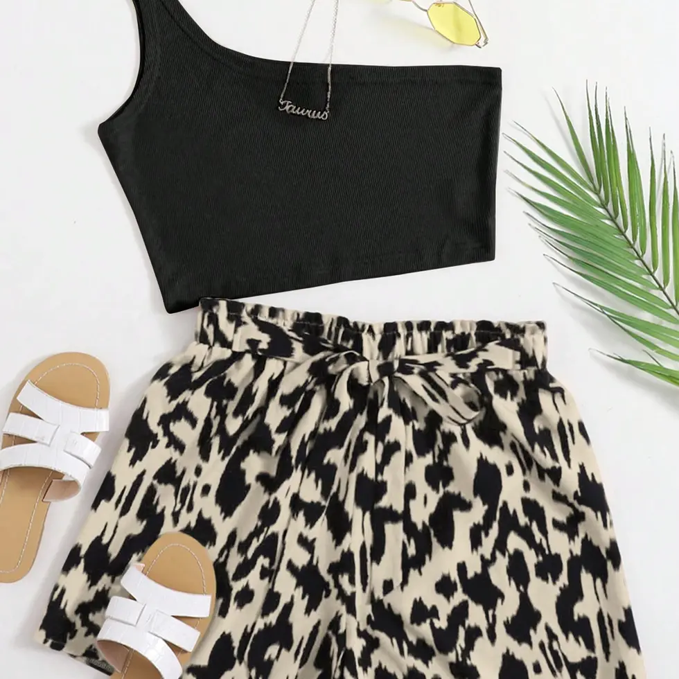 Get your summer wardrobe ready with this stylish One Shoulder Top & Graphic Print Shorts set! The sleeveless top features an asymmetrical neckline, perfect for a beach day or casual outing. The rib-knit, paperbag waist shorts are belted for a trendy look and are designed in a multicolor graphic print for a fun and playful style. The crop top and shorts combination is perfect for staying cool in the summer heat. Made from a comfortable and breathable material, this set is a must-have for any casual occasion.