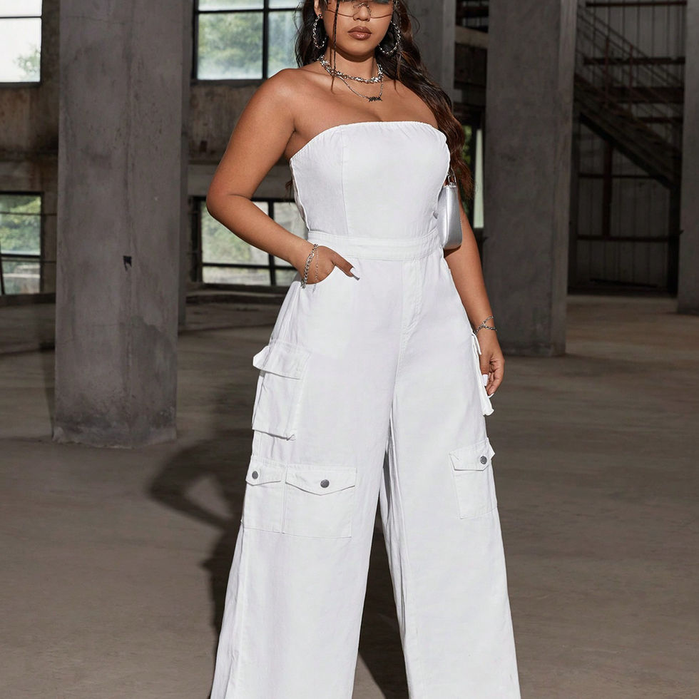 A sleek and casual strapless jumpsuit featuring a backless design, high waist, zipper closure, and functional pockets, crafted from non-stretch 100% cotton denim for a structured yet comfortable fit; machine washable.