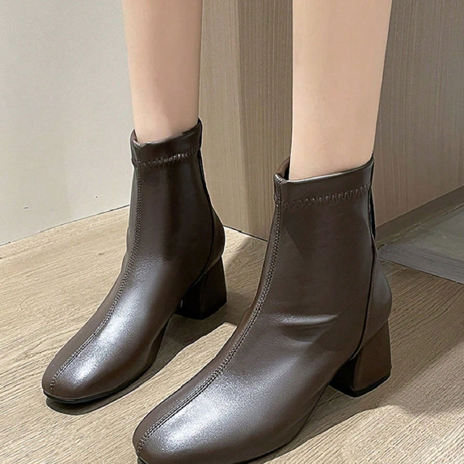 Square Toe Back Zip Chunky Heeled Leather Boots