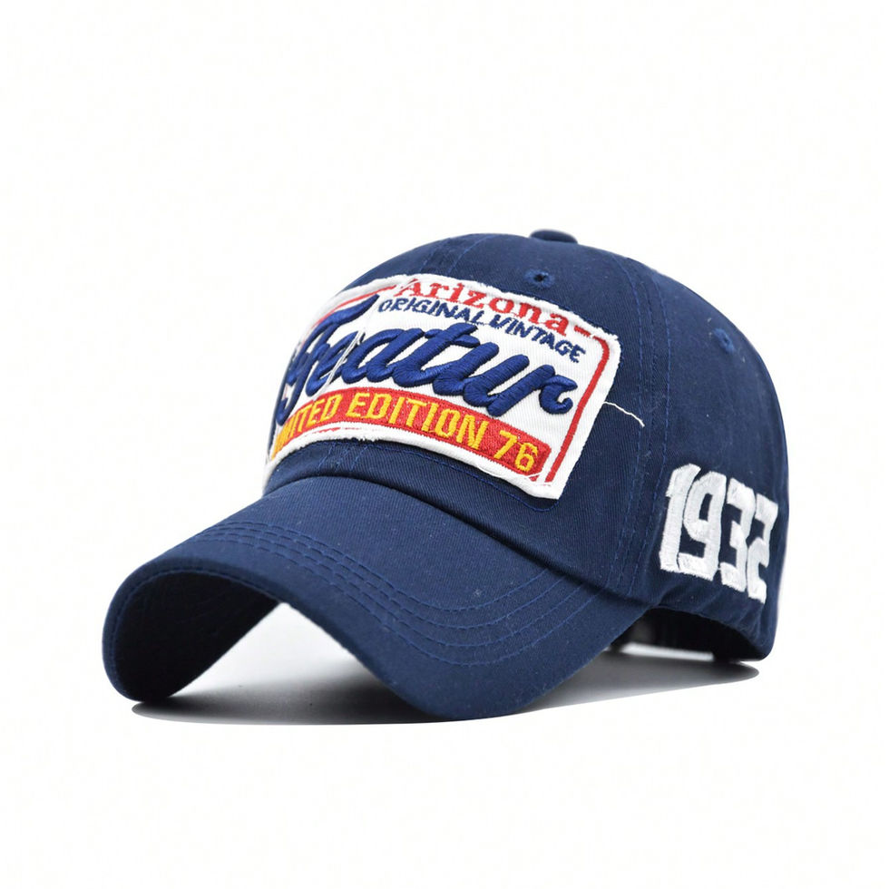 A stylish unstructured baseball cap featuring embroidered letter details and patched accents, crafted from 100% polyester fabric with anti-UV functionality for both protection and style.