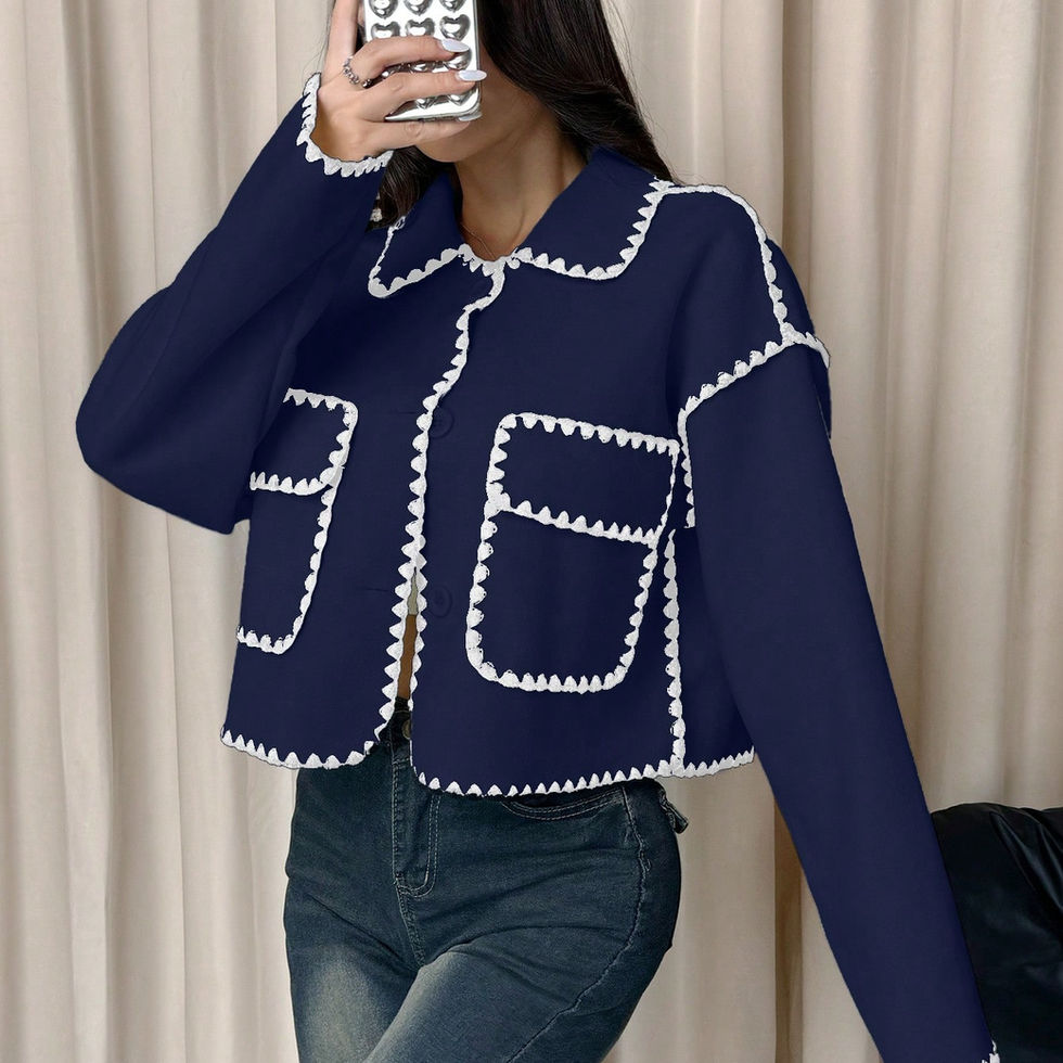 Featuring a sophisticated colourblock design with contrast binding, this unlined jacket boasts a single-breasted placket with buttons, a collar neckline, and practical pockets. Designed for casual wear, its drop shoulder sleeves and regular hem shape make it a perfect fit for the spring and fall temperatures ranging between 18-25℃ (63-77℉). Unlined for a lightweight feel, this cropped jacket in classic black and white adds a modern edge to any ensemble, marrying timeless sophistication with contemporary trends.